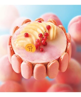 香り高い桃のソルベと、さわやかな風味を感じますヴァーベナのアイスに、キューブ状の桃と粒状の赤すぐりを混ぜています。そして、その周りをピンク色のビスキュイで囲んでいます。限定300点で、価格は5,670円(税込)です。