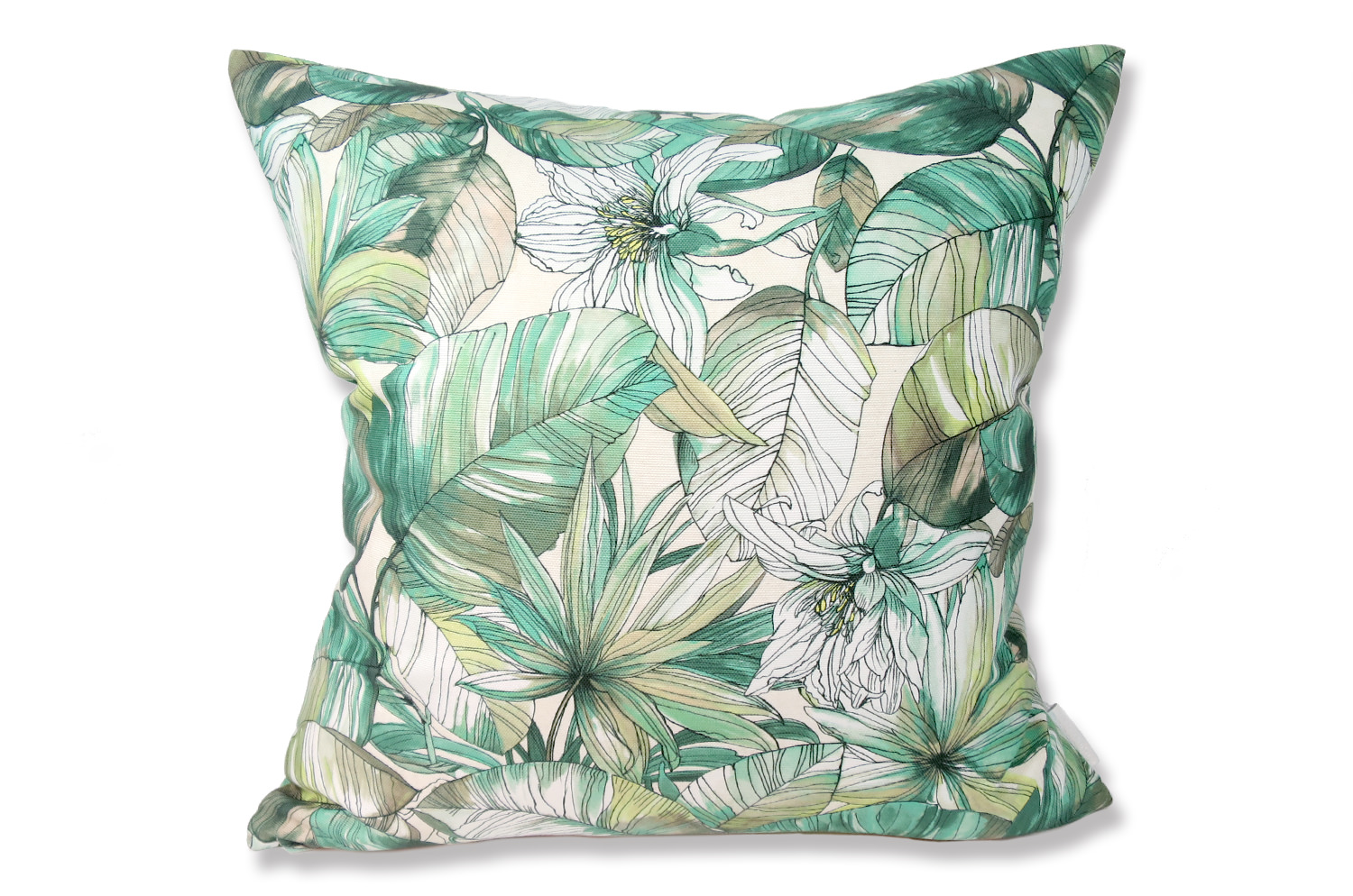 緑の植物が描かれました、涼しげなデザインのクッションカバー「The Botanical ボタニカルクッションカバー sun+sun」。生地には、スペインでデザインとクオリィともに高い評価を受けているブランドのものを使用しています。